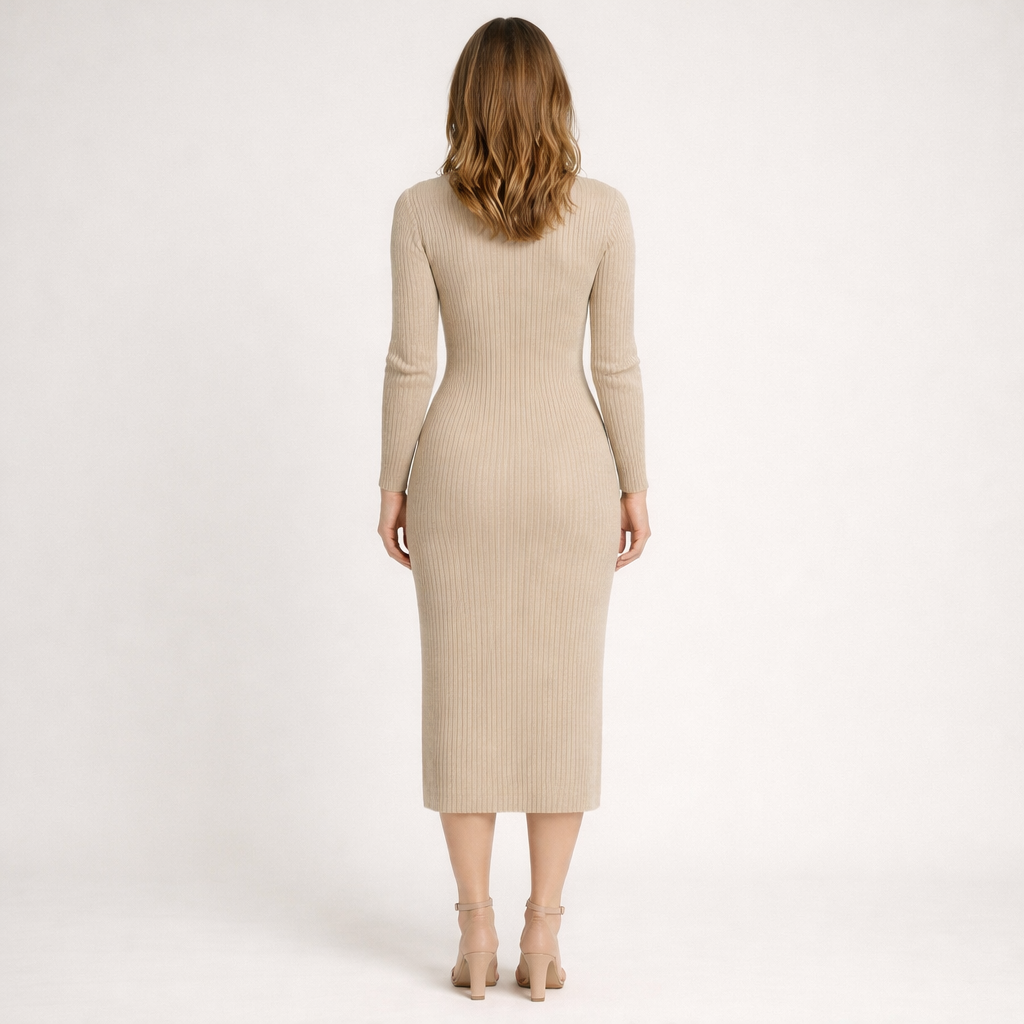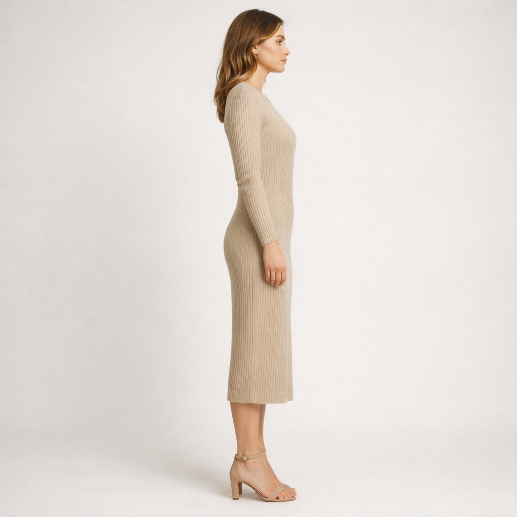 Bestil denne ribstrikkede midikjole og tilføj et stilrent og pålideligt element til din garderobe.