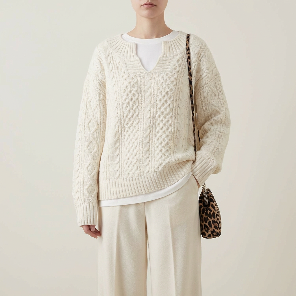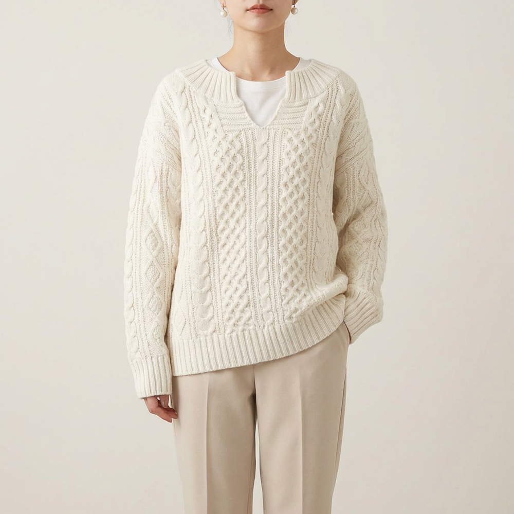 Kabelstrikket sweater til kvinder med V-hals
