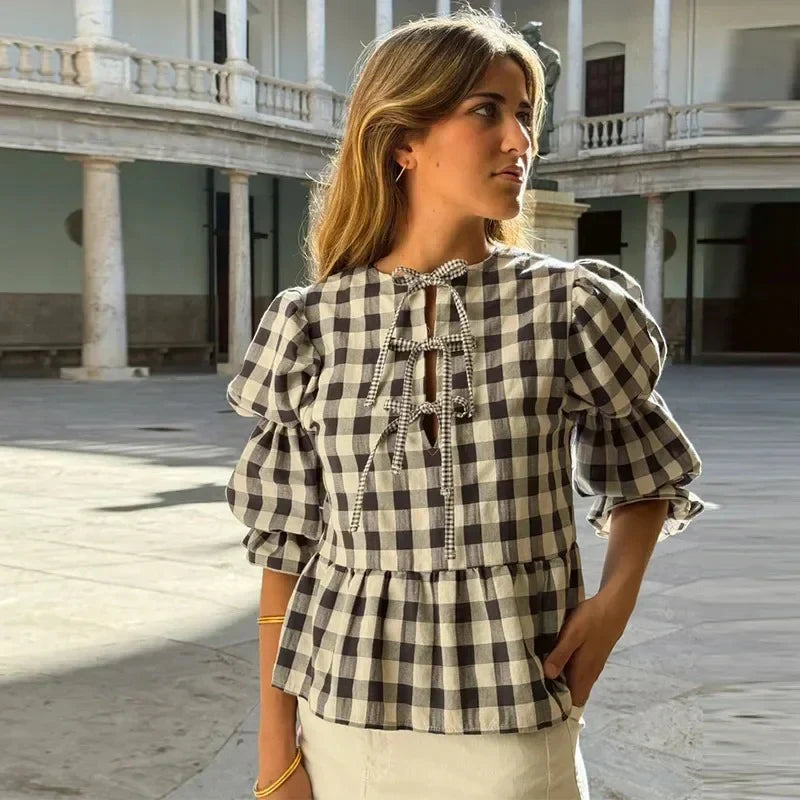 Ternet bluse med pufærmer og bindebånd til kvinder