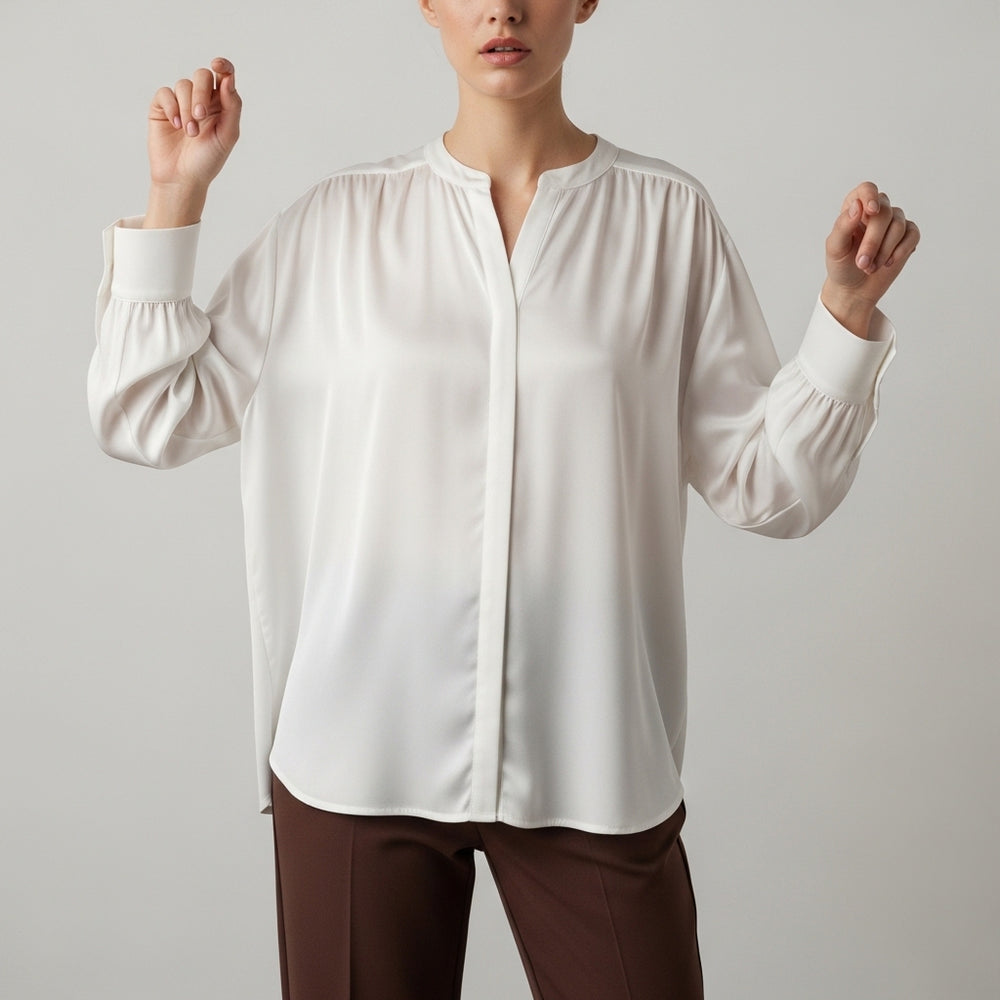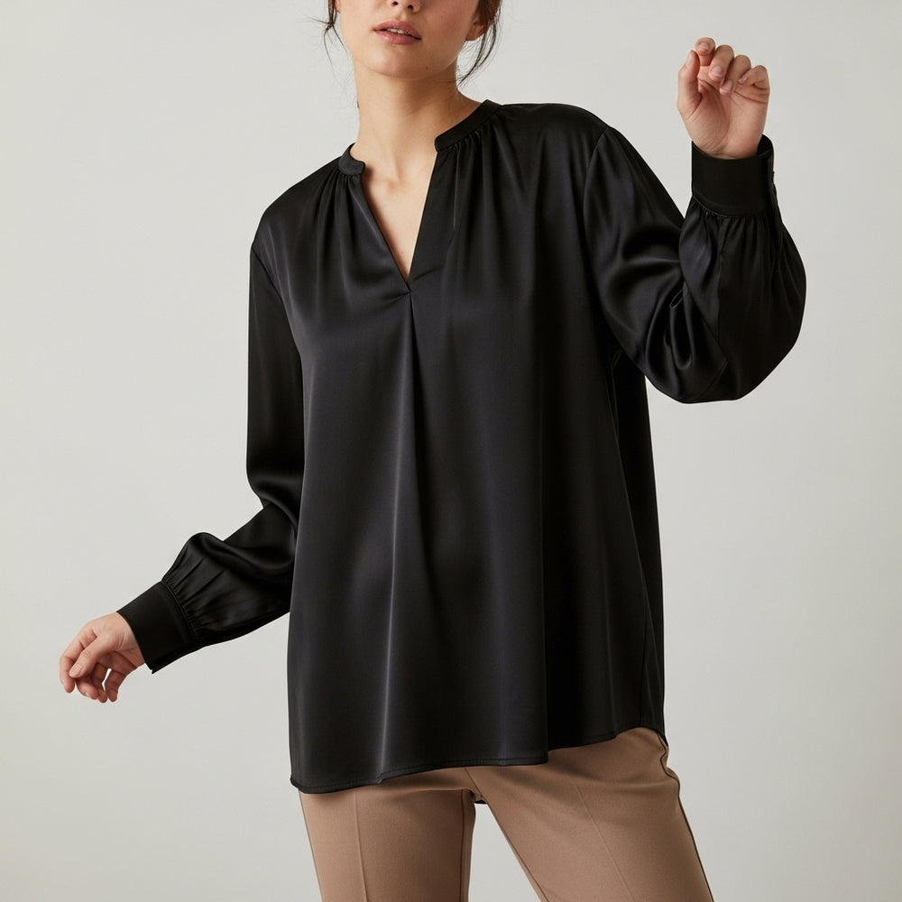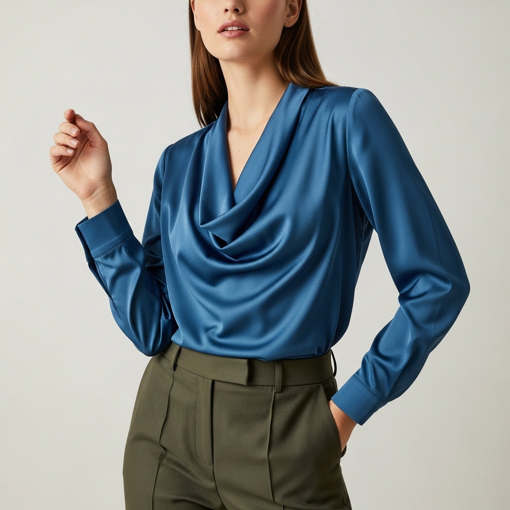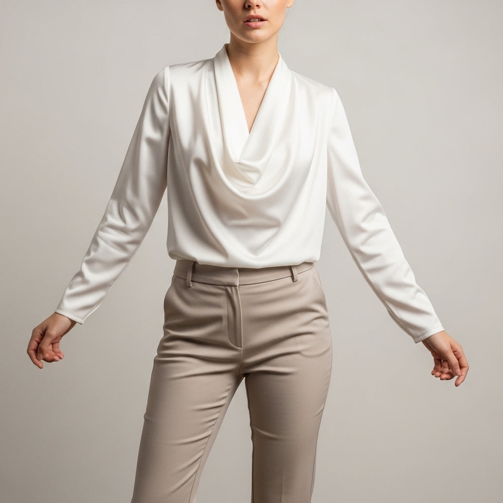Satinbluse til kvinder med draperet hals og lange ærmer